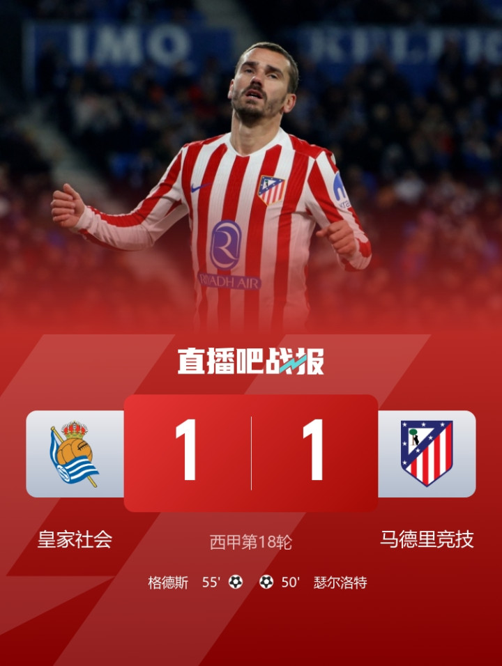 直播吧1月5日讯北京技巧1月5日凌晨4时整,2025-26赛季西甲第18轮在阿诺塔球场张开角逐,马德里竞技客场对阵皇家社会。上半场瑟尔洛特乌龙越位无效,下半场瑟尔洛特先拔头筹,小西蒙尼助攻,格德斯扳平,久保建英助攻。最终马竞客场1-1战平皇家社会,马竞各赛事4连胜闭幕,积38分仍居第4+距榜首巴萨11分,皇社联赛5轮不堪。