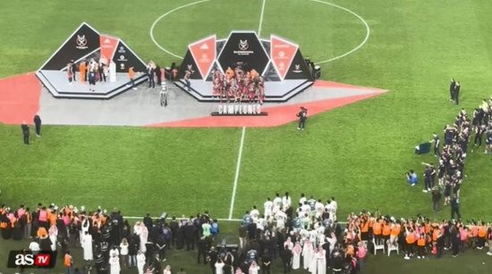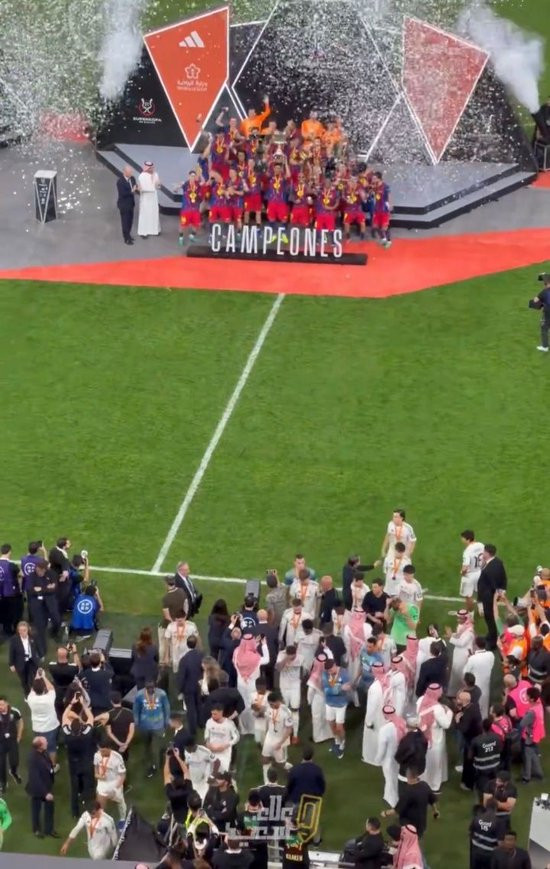 《阿斯报》发布的视频也显现,在巴萨球员捧杯时皇马球员们归拢在边线隔邻,待巴萨众将捧杯后他们就离开了时事。