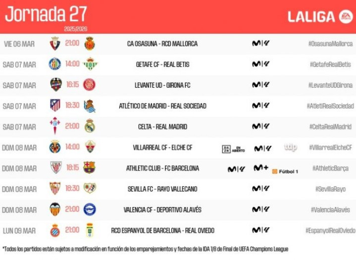 直播吧2月12日讯西甲官方公布联赛第27轮各场开球时辰,北京时辰3月8日凌晨4点皇马客战塞尔塔,9日1点15毕尔巴鄂竞技vs巴萨。