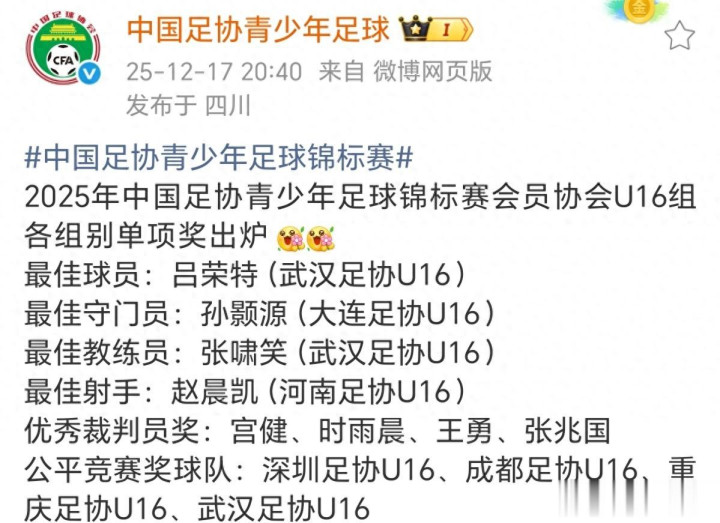 2025年中国足协青少年足球锦标赛会员协会U16组单项奖出炉体育录像/图片,河南足协U16球员赵晨凯打入5球,成为赛会最好弓手。