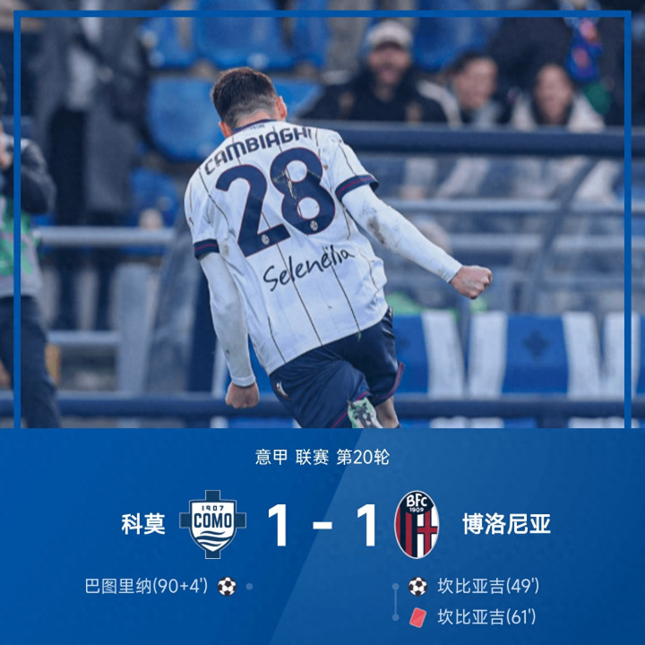 而后坎比亚吉肘击敌手,裁判不雅看VAR后出示红牌将其罚下,而即是他的这一应酬行径让博洛尼亚痛失3分。补时阶段,巴图里纳兜射破门,科莫1-1读秒绝平博洛尼亚。