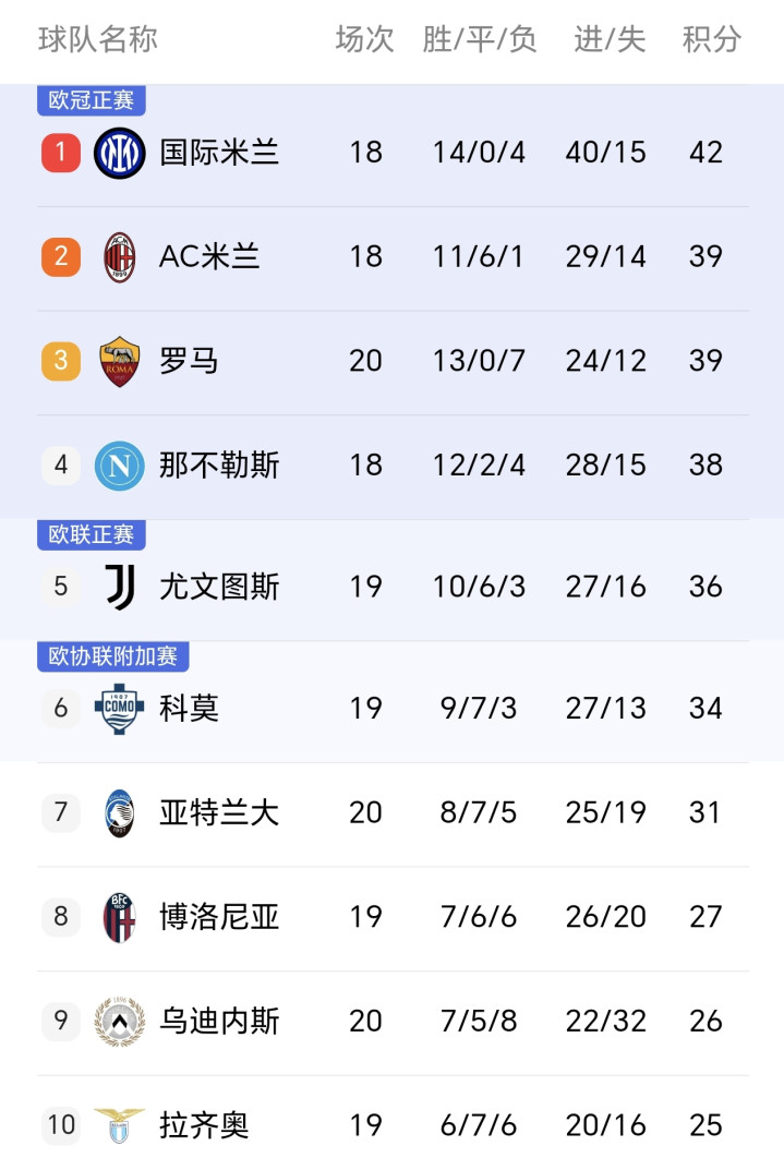 跟着比赛截止,意甲最新积分榜如下