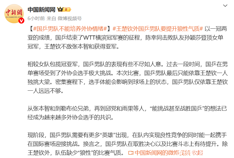 在WTT横滨冠军赛的决赛赛场上,王楚钦以2-4不敌日本选手张本智和,屈居男单亚军,这场失利闭幕了他对张本智和的八连胜记载,更让国乒男队堕入新一轮反念念,当张本智和脱衣庆祝得手,王楚钦千里默收拍,国乒男队的“霸主危急”再次被推至公论中心,况兼在北京时刻8月12日这天,官方媒体《中国新闻网》更是点石成金点评国乒男队:不行仅靠王楚钦,戎行禁锢狼性气质!